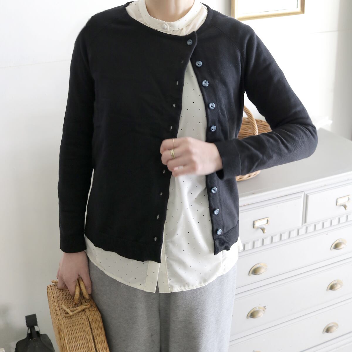 コットン100%の日本製カーディガン。しっかりとした生地感で程よい厚みもあります。すっきりとしたシルエットとボタンがライダースジャケットのように左寄りに並んでいます。開けて着ていただいても、ボタンを一つ閉めても様になるようなカーディガンです。カーディガンは濃紺でボタンはブルーです*